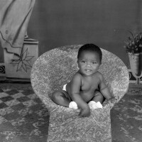 Baby from Bamendjinda sitting in a rattan armchair, leaning forward, white bootees and shorts, very alert. Format of original: 59mm x 59mm plastic negative