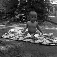 304. EAP054/1/81/240 Reference (shelfmark): EAP054/1/81/240 Title: Recreational photograph [c 1977] Scope & Content: Baby sitting on a sheet in front of bushes Format of original: 59mm x 59mm plastic negative Collection Area: Endangered Archives Programme Languages: Not applicable Date Range: c 1977 Extent: 1 TIFF image