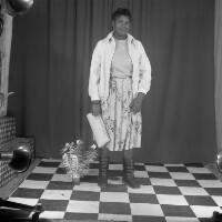 32. EAP054/1/36/45 Reference (shelfmark): EAP054/1/36/45 Title: Recreational photograph [c 1987] Scope & Content: Women from Mbouda standing holding a handbag by tinsel bouquet Format of original: 59mm x 59mm plastic negative Collection Area: Endangered Archives Programme Languages: Not applicable Date Range: c 1987 Extent: 1 TIFF image