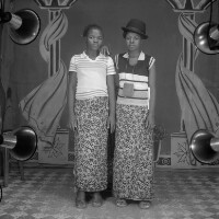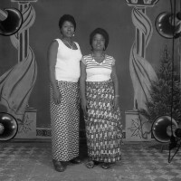 2 female friends from Babadjou standing, in T-shirts and "pagne" skirts, dark shoes, necklaces, earrings, simple hairstyles. Format of original: 59mm x 59mm plastic negative