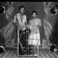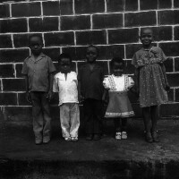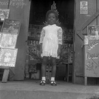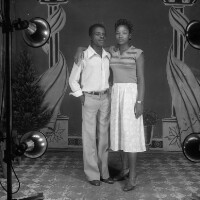 Couple from Babadjou standing, man in dark trousers and white short-sleeved shirt, women in dress and white shoes, their hands on an iron grillwork. Format of original: 59mm x 59mm plastic negative