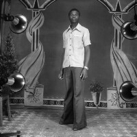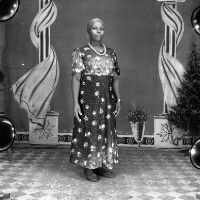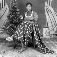 Women from Mbouda sitting, legs crossed, her "pagne" skirt trailing on the floor, right hand on plastic tree next to her, leather sandals. Format of original: 59mm x 59mm plastic negative