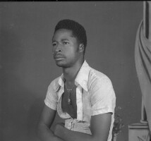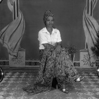 Young woman from Bagam, sitting, legs crossed, "pagne" skirt trailing on the ground, white short-sleeved shirt and shoes. Format of original: 59mm x 59mm plastic negative