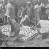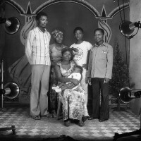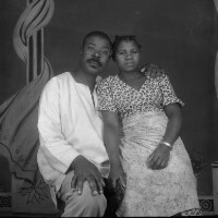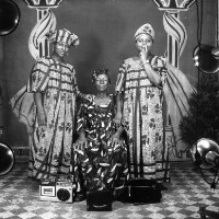 2 women from Mbouda [standing] flanking their woman [seated] one with a radio, the other a dark handbag [both on floor]. Format of original: 59mm x 59mm plastic negative