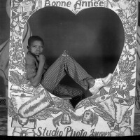 Boy from Bati reclining, dark clothes, white shoes, right hand on chin, sitting within the [Bonne Annee] New Year cutout Format of original: 59mm x 59mm plastic negative