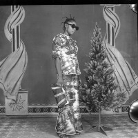 Girl from Bamekombou standing, handbag in right hand, floral outfit, sunglasses, exaggerated thin plaits, next to plastic tree. Format of original: 59mm x 59mm plastic negative