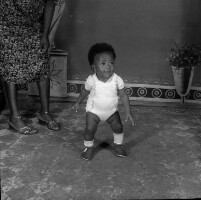 Baby from Bangang standing, supervised by someone on the left (feet visible) in white romper suit and socks, dark shoes. Format of original: 59mm x 59mm plastic negative
