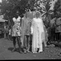 41. EAP054/1/108/141 Reference (shelfmark): EAP054/1/108/141 Title: Recreational photograph [c 1970-c 1995] Scope & Content: Bridal couple, both under veil, standing with another woman, other people and trees behind. Format of original: 59mm x 59mm plastic negative Collection Area: Endangered Archives Programme Languages: Not applicable Date Range: c 1970-c 1995 Extent: 1 TIFF image