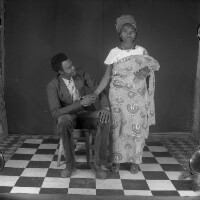Couple from Bafounda, man sitting in dark jacket, holding hand of woman, standing, in "pagne" outfit, both in dark shoes. Format of original: 59mm x 59mm plastic negative