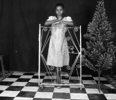 45. EAP054/1/173/92 Reference (shelfmark): EAP054/1/173/92 Title: Recreational photograph [c 1989] Scope & Content: Girl standing behind iron grillwork by plastic tree Format of original: 51mm x 59mm plastic negative Collection Area: Endangered Archives Programme Languages: Not applicable Date Range: c 1989 Extent: 1 TIFF image