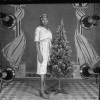 57. EAP054/1/50/103 Reference (shelfmark): EAP054/1/50/103 Title: Recreational photograph [c 1980] Scope & Content: Woman standing, plastic tree in front of her. Format of original: 59mm x 59mm plastic negative Collection Area: Endangered Archives Programme Languages: Not applicable Date Range: c 1980 Extent: 1 TIFF image