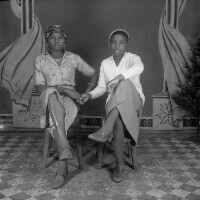 58. EAP054/1/50/104 Reference (shelfmark): EAP054/1/50/104 Title: Recreational photograph [c 1980] Scope & Content: 2 young women sitting, feet crossed, holding right hands, one with left hand on hip, the other with left hand on her knee. Format of original: 59mm x 59mm plastic negative Collection Area: Endangered Archives Programme Languages: Not applicable Date Range: c 1980 Extent: 1 TIFF image
