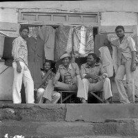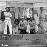 60. EAP054/1/50/116 Reference (shelfmark): EAP054/1/50/116 Title: Recreational photograph [c 1980] Scope & Content: 5 men with clothes on hangers behind [tailors?]. Format of original: 59mm x 59mm plastic negative Collection Area: Endangered Archives Programme Languages: Not applicable Date Range: c 1980 Extent: 1 TIFF image