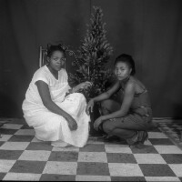 Woman from Babadjou and daughter crouching, facing each other, woman in white with hand on plastic tree. Format of original: 59mm x 59mm plastic negative