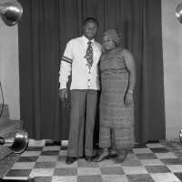 66. EAP054/1/46/162 Reference (shelfmark): EAP054/1/46/162 Title: Recreational photograph [c 1984 - 1985] Scope & Content: Couple standing, he holds glasses in right hand, left arm round his wife; he is from Babadjou (Kombou). Format of original: 59mm x 59mm plastic negative Collection Area: Endangered Archives Programme Languages: Not applicable Date Range: 1984-1985 Extent: 1 TIFF image