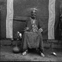 65. EAP054/1/147/38 Reference (shelfmark): EAP054/1/147/38 Title: Recreational photograph [c 1970-c 1995] Scope & Content: Old man sitting, cow horn drinking vessel in right hand, peace plant in gourd by his right foot. Format of original: 59mm x 59mm plastic negative Collection Area: Endangered Archives Programme Languages: Not applicable Date Range: c 1970-c 1995 Extent: 1 TIFF image