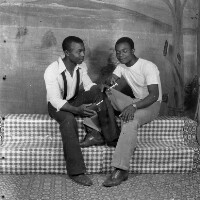 68. EAP054/1/147/70 Reference (shelfmark): EAP054/1/147/70 Title: Recreational photograph [c 1970-c 1995] Scope & Content: 2 young men sitting on stepped bench, each with one foot on bench, one holding radio. Format of original: 59mm x 59mm plastic negative Collection Area: Endangered Archives Programme Languages: Not applicable Date Range: c 1970-c 1995 Extent: 1 TIFF image
