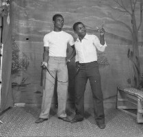69. EAP054/1/147/71 Reference (shelfmark): EAP054/1/147/71 Title: Recreational photograph [c 1970-c 1995] Scope & Content: 2 young men standing, both holding a cord. Format of original: 57mm x 59mm plastic negative Collection Area: Endangered Archives Programme Languages: Not applicable Date Range: c 1970-c 1995 Extent: 1 TIFF image