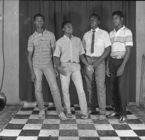 64. EAP054/1/169/175 Reference (shelfmark): EAP054/1/169/175 Title: Recreational photograph [c 1985] Scope & Content: Standing, four young men from Mbouda Format of original: 57mm x 59mm plastic negative Collection Area: Endangered Archives Programme Languages: Not applicable Date Range: c 1985 Extent: 1 TIFF image