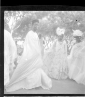 766. EAP449/2/6/822 Reference (shelfmark): EAP449/2/6/822 Title: Three women wearing large pagnes and a man wearing a large boubou during a marriage ceremony. Collection Area: Endangered Archives Programme Languages: Not applicable Date Range: 2nd half od the 20th century Extent: 1 TIFF image