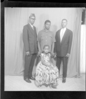 841. EAP449/2/6/22 Reference (shelfmark): EAP449/2/6/22 Title: A man wearing a boubou, sitting facing forward and three children standing next to him, facing forward in the studio. Collection Area: Endangered Archives Programme Languages: Not applicable Date Range: 2nd half od the 20th century Extent: 1 TIFF image