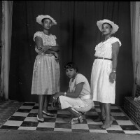85. EAP054/1/171/178 Reference (shelfmark): EAP054/1/171/178 Title: Recreational photograph [c 1986] Scope & Content: Woman crouching between 2 women standing each with wide brimmed hats Format of original: 59mm x 59mm plastic negative Collection Area: Endangered Archives Programme Languages: Not applicable Date Range: c 1986 Extent: 1 TIFF image