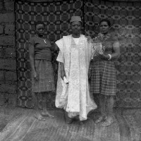 Three people: man between his 2 wives, the one on the left holding a bunch of flowers. By a house