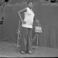 Woman standing, right hand on hip, left hand and handbag on iron grillwork.