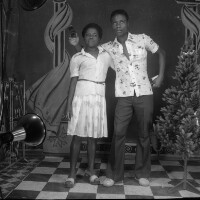 Young couple from Babete standing, girl in white, boy in white short-sleeved shirt and dark trousers.
