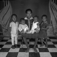 Young woman sitting, barefoot, holding 2 babies, 2 older children standing next to her.