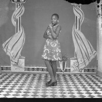 Young women from Mbouda standing, legs crossed, dark shoes, dress, left hand by chin, right arm across waist.