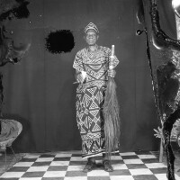 Bamedjo elder standing, in traditional Bamileke dress, horse tail fly whisk in left hand, cows horn drinking vessel in right, dark shoes.