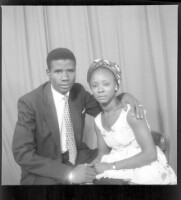 - A couple sitting in the studio; the man wearing a suit and the woman wearing a white dress
