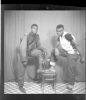 - Two men standing in profile, each with his foot on a chair, in the studio.