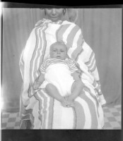 - A portrait of a baby (seated in mother's lap with cloth as a backdrop).