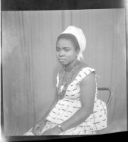EAP449/2/13/14 : A woman wearing a dress, a white head-wrap, earrings, a necklace, and a wrist watch sitting in profile on a chair in the studio. - Hierarchy: