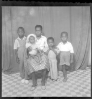 - Five people, a woman sitting with a baby, a little girl standing, and two boys standing, all face-forward in the studio.