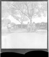 EAP449/2/14/10 : Two men wearing large pants, shirts, and hats riding bikes outdoors on a road. - Hierarchy: