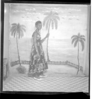 EAP449/2/17/19 : Profile view of a woman standing in the studio wearing a dress and a necklace. - Hierarchy: