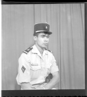 - A man wearing a military uniform and a kepi (flat, military hat) sitting profile view in the studio