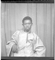- A man wearing a boubou, sitting full frontal view in the studio