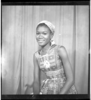 - A woman wearing a tussu dress, a head scarf and smiling, sitting and facing forward