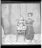 - Full portrait of two children, one sitting on a chair and smiling and a little girl standing, wearing a full camisole and a necklace, facing forward