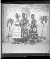 - Full portrait of three girls standing, one wearing a white dress and the other two wearing black dresses, standing in front of a curtain with three palm trees, facing sideways