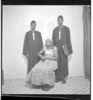 EAP449/2/23/12 : A woman wearing a dress and head wrap sitting face-forward in front of two men wearing boubous and hats, one holding a handbag,… - Hierarchy: