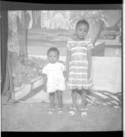 EAP449/2/27/4 : Full shot of two little girls standing wearing white and grey dresses and white shoes in the studio. - Hierarchy: