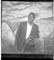 EAP449/2/27/19 : A man standing wearing a white shirt and black suit and black pants, smiling, arm on his knee in the studio in profile. - Hierarchy: