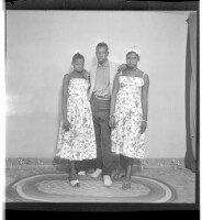 EAP449/2/29/2 : A man wearing a shirt and pants standing face-forward in between two girls, all standing in profile on a mat in the studio. - Hierarchy: