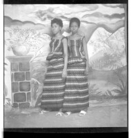 EAP449/2/29/18 : Two girls wearing dresses and pagnes both standing in profile in a studio decorated with clouds, flowers, and a flower pot on a… - Hierarchy: