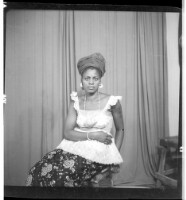 EAP449/2/29/21 : A woman wearing a dress, pange, head wrap, and necklace sitting face-forward on a stool in the studio. - Hierarchy: